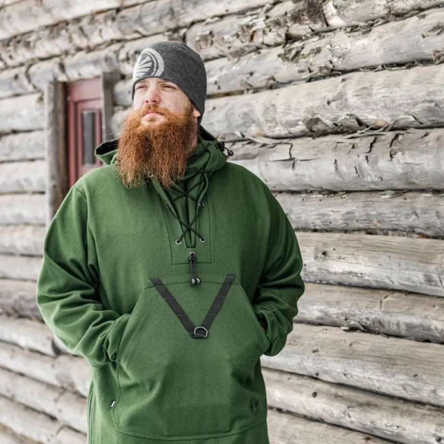 WALDMACK LODENANORAK FOR MEN – PETROMAX The Waldmack Loden Anorak by Petromax is made of pure new wool. Explore untouched landscapes and remote corners while relying completely on your loden gear. The Waldmack is naturally spark resistant, as well as water and wind repellent, thanks to its loden outer material. Brave the elements additionally thanks to the extremely thick layer of 700 g of tightly rolled virgin sheep’s wool per linear meter. Because so neither thorns nor bad weather stick to you. Designed as a slip-on jacket, the loden anorak has the advantage that it can be easily slipped over your lower clothing. The high collar and the long back closure can be adjusted with a drawstring so that you can sit wind-protected at your camp and enjoy the glow of the fire. The wide and straight anorak cut offers you a comfortable fit and best freedom of movement. So you can unrestrictedly prove your abilities in the nature. The large kangaroo pocket gives you immediate access to your indispensable tools, and the loop with D-ring provides the necessary space for your bushcraft knife and fire steel. The embroidered dragon logo on the hip and shoulder give your Waldmack an additional fiery look.Don’t let weather or seasons stop you and get the raw taste of primal adventure with your Waldmack.Product Features of the Waldmack at a Glance- Hood and high neck each with drawstring- Side zippers for quick on and off- Large kangaroo pocket- Patch pocket with D-ring- Buttonable