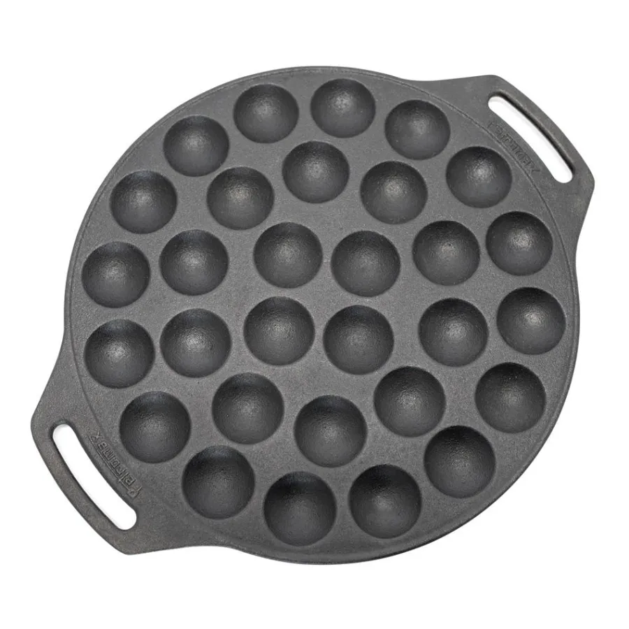 Whether you’re cooking over an open fire or over the hot embers of your barbecue, the poffertjes pan will sweeten your efforts in any situation. The two handles guarantee safe handling. In addition, the pan with a diameter of 30 cm fits perfectly into your Petromax Atago and rests on the upper edge. Even at home, you do not have to do without the unmistakable taste, because the undersides of the 30 baking wells are flattened. This means that the poffertjes pan is stable on the baking tray and can be used in the oven as well as on all common types of stove.
