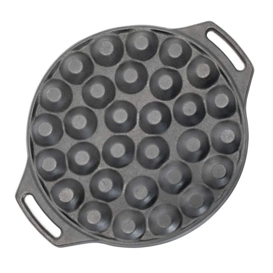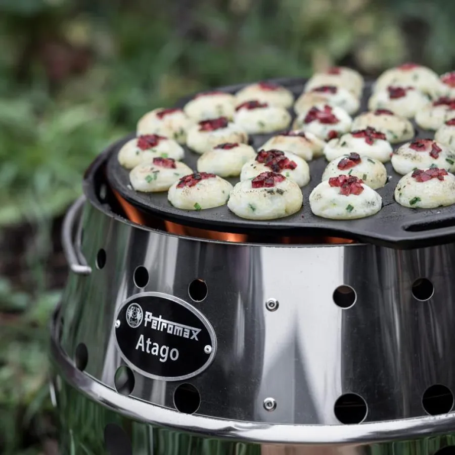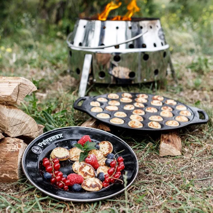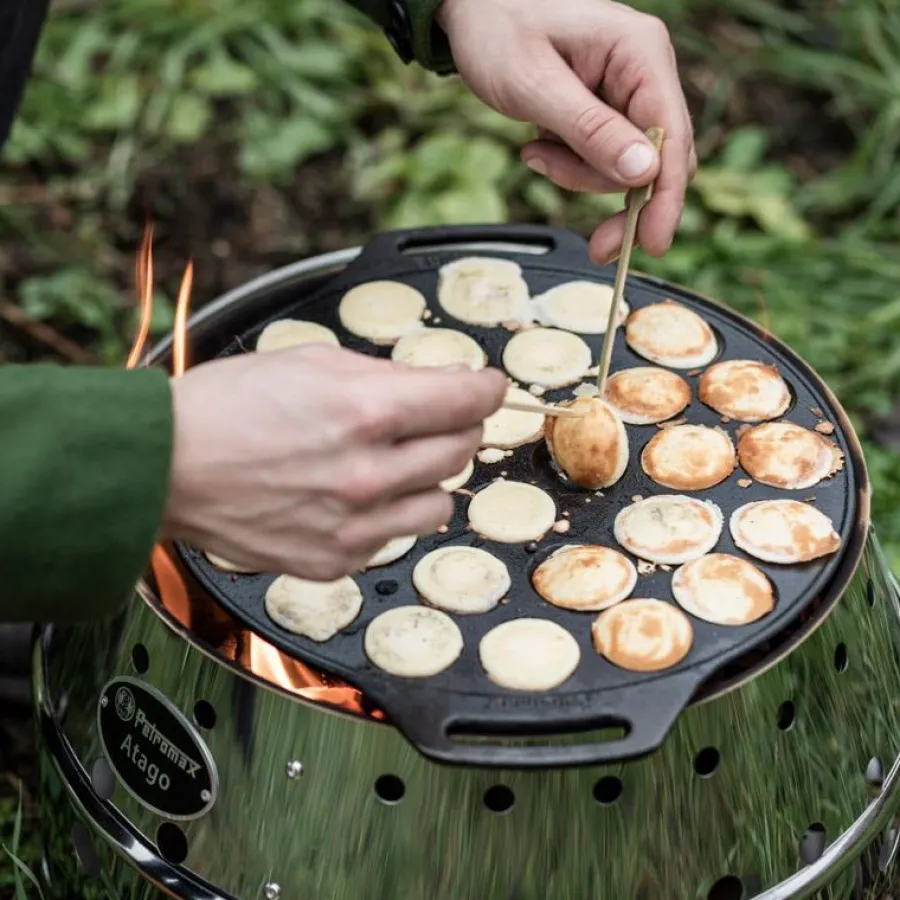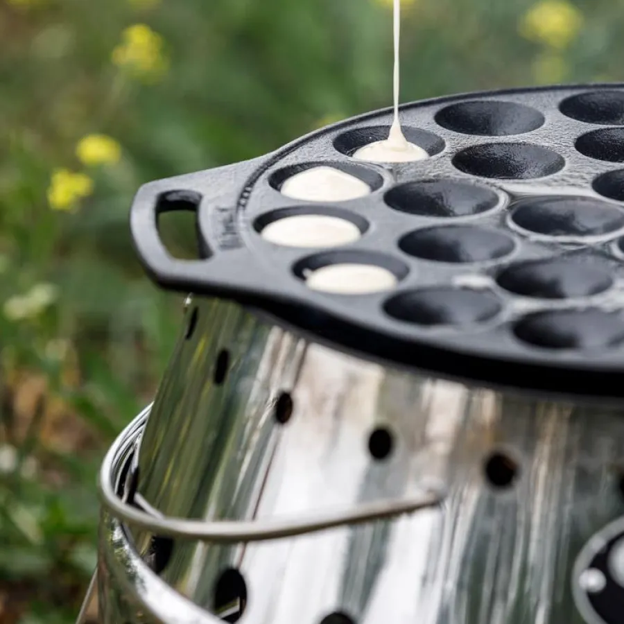 For a taste of adventure in bite-sized portions: The poffertjes pan helps you to create an extraordinary dessert around the campfire and will delight the youngsters in the group. With the special cast iron pan, you can bake 30 pieces of the Dutch mini pancakes at the same time and in no time at all. The excellent heat conductivity of the cast iron poffertjes pan also ensures an even baking result.